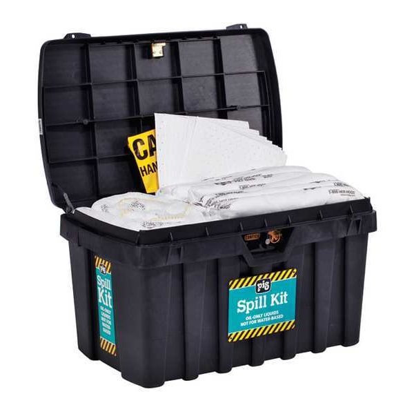 Spill Kit, Fluids Absorbed Oils, Neutralizes Chemical Type Not Applicable, Volume Absorbed Per Kit 44 gal, Container Type Chest, Not Applicable Container Capacity, 23 in W x 37 in L x 20 1/2 in H Container Size, Black, Filled, Sorbents Included (100) PIG(R) STAT-MAT Absorbent Pad (20 in L x 15 in W) (MAT214), (6) PIG(R) Oil-Only Absorbent Boom Ext. (10 ft L x dia 3 in) (BOM406), (6) PIG(R) Skimmer Oil-Only Absorbent Sock (48 in L x D 3 in) (104PS), PPE Included Not Applicable