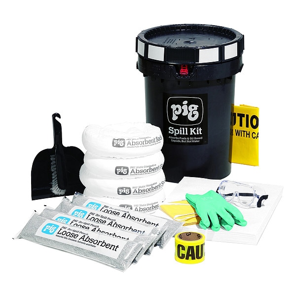 Spill Kit, Fluids Absorbed Oils, For Use With Chemical or Metal Type Fuels, Specialized Applications Fuel Stations, Neutralizes Chemical Type Not Applicable, Volume Absorbed Per Kit 8 gal, Container Type Bucket, 12 gal Container Capacity, 31 3/4 in W x 31 3/4 in L x 21.125 in H Container Size, Black, Filled