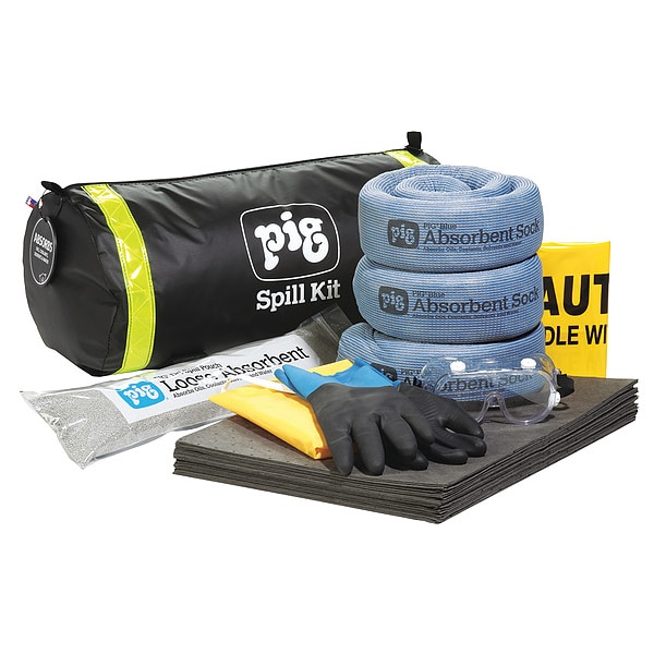 Spill Kit/Station, Fluids Absorbed Universal, Volume Absorbed Per Kit 5 gal, Container Type Bag, 0.05 cu ft Container Capacity, 10 in W x 22 in L Container Size, Black, Filled, Sorbents Included (25) 15 in x 20 in Absorbent Mat Pads, (3) Exterior dia 3 in x 48 in Blue Absorbent Socks, (1) Dry Loose Absorbent in Spill Pouch, PPE Included (1) Apron, (1) Pair Goggles, (1) Pair Neoprene Gloves, Additional Components Included (1) Vinyl Bag (External dia 10 in x 22 in), Lockable No