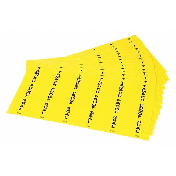 Tamper Seal, Legend Tamper Proof Seal, Material Vinyl, Background Color Yellow, Dimensions 2 in x 6 in, Seals/Sheet 6, Sheets/Pack 17, Seals/Pack 102, Seal Height 6 in, Seal Width 2 in, Package Quantity 102
