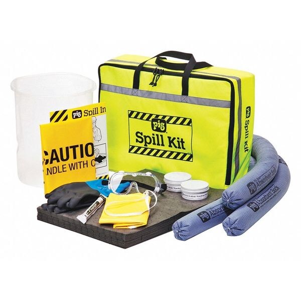 (3) 3 in diax 48 in L Absorbent Sock, (40) 15 in W x 20 in L Absorbent Mat Pad, (2) 3 1/4 in dia x 1 3/4 in H Patching Paste, (1) Collapsible Container, (1) 13 in L Neoprene Gloves, (1) Pair of Goggles, (1) Apron, (1) Lightstick, (5) 18 in W x 30 in H Polyethylene Disposal Bags, (1) Instructions
