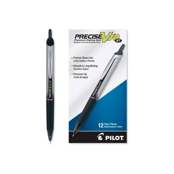 Pilot Precise V10RT Retractable Roller Ball Pen, Bold 1 mm, Black Ink/Barrel, Dozen