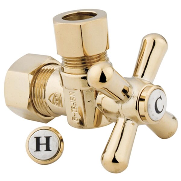 Angle valve Premium color finish resist tarnishing and corrosion Fine artistic craftsmanship Hot and cold index included. Features -1/4 Turn Angle Stop -1/2 in. COMP 1/2 in. OD Angle Stop -High Quality Brass Construction -Handle Type - X -Finish - Polished Brass