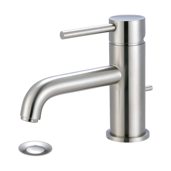 This PIONEER FAUCETS Single Handle Bathroom Faucet is a modern style with a brushed nickel finish. It has a single hole installation and a lever handle. The overall height is 6", the overall width is 2.13", and the spout reach is 5.75". It has a ceramic disc valve type and a compression hose connection type. The center-center fitting size is single hole and the flow rate is 1.2 GPM. The weight is 5.4.