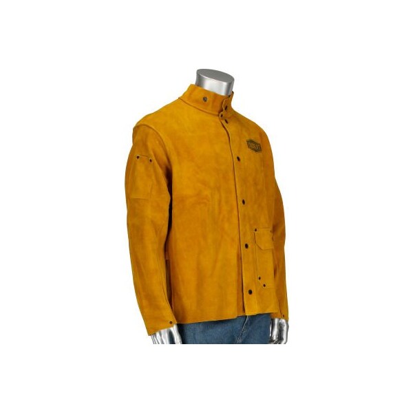 Leather jacket specially tanned for heat resistance protects from spark and spatter. Black anodized snaps and rivets do not corrode and prevent flashback. Snaps are reinforced with additional piece of leather while rivets are placed in high stress areas ensuring long life of garment.
