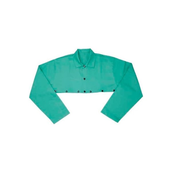 Ironcat irontex flame retardant cotton cape sleeve, green, medium, all cotton irontex flame retardant 9 oz green 100% cotton fabric protects upper body and arms from spark and spatter. Black anodized snaps and rivets do not corrode and prevent flashback. Designed to coordinate with fr cotton bib attachment. Astm d6413. Flame resistance lasts the life of the garment with proper care and maintenance of 100 home washings and 50 commercial washings.