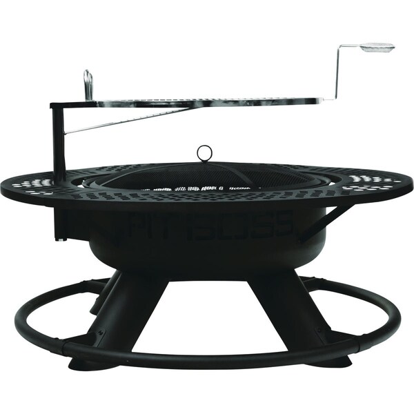 2-in-1 wood fire pit and grill. 483 square inches of cooking surface 24.8-inch grid diameter. Stainless steel grid construction. Innovative design features a swivel stainless steel grate for authentic wood-fired cooking. You can adjust the grate height to cook with more or less heat or remove it completely to enjoy the flames. The large-capacity bowl holds enough wood to burn for hours while the wide-base design and heavy-duty steel construction offer long-lasting outdoor use. Also features a wraparound mesh shelf that acts as a convenient side table for setting down food or drinks. Plus with safety features like a mesh spark screen and effortless ash cleanout it is ideal for backyards with families or pets. Removeable and adjustable swivel grate wraparound mesh shelf removeable ash and ember clean out pan mesh spark screen high temperature black sand finish heavy gauge stainless steel handle.