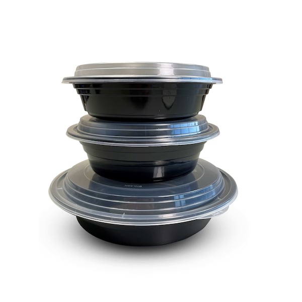 The 32 oz 7 inch round container combo features a black microwaveable container paired with a clear lid for food visibility and secure closure. Made from durable materials, this container is designed to resist spills and leaks while being stackable for efficient storage. Ideal for transporting salads, pastas, and entrees, it offers convenience for on-the-go meals. The combination of a sturdy black base and a transparent lid allows easy identification of contents without opening. Available in a pack of 300, the container’s dimensions accommodate substantial portions, making it suitable for various foodservice applications.