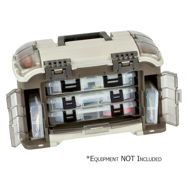 Guide Series Angled Tackle System 3600 Main compartment presents utility boxes at a 15-degree angle for ease of access. Integrated expandable rear pocket. DuraView covers and doors. Non-skid rubber feet. Two top-access storage areas and spacious storage under lid. Sturdy locking latches and carry handle. L=18in. x W=11in. x H=9.5in.. Sandstone Includes: Tackle Box. Three 3600 Series StowAway Utility Boxes. Two 3400 Series StowAway Utility Boxes. One Polycarbonate Wallet.