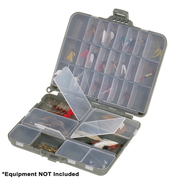 Compact Side-By-Side Tackle Organizer - Grey/Clear. Features: Two-sided storage with multiple plastic door covers. Creates 11-32 adjustable compartments. Transparent for quick and easy identification of contents. Great for small jigs and flies. Color: Clear. Dimensions: L=4.67in. x W=4.15in. x H=1.38in..
