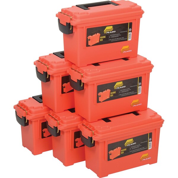 Plano131252 Marine Emergency Box, Tough and functional dry boxes are great for tackle, tools, emergency supplies or anything else you might need to keep dry onboard. Built in the USA, these dry boxes feature a special tongue and groove lid to seal out moisture while the water-resistant, urethane O-ring seals secure the lid completely from water. An easy-to-access, top storage compartment allows you to store items you may need at a moment's notice while the over-molded handles with rubberized grips offer easy, comfortable carrying no matter how heavy the load. Features top access storage compartment. Convenient, over-molded carry handle. Heavy-duty, brass and bailed latch. Watertight and water resistant O-ring seal.