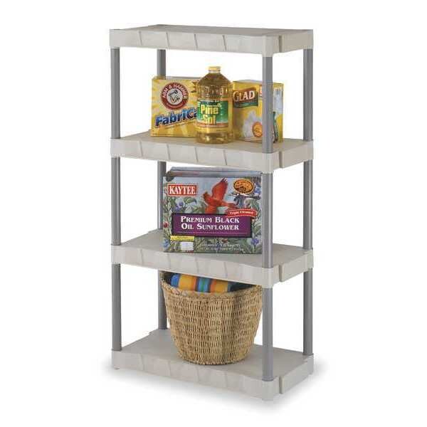 Plastic Shelving, Tan, Overall Depth 16 in, Overall Height 56 in, Overall Width 31 in, Shelf Style Solid, Shelving Material Polypropylene, Number of Drawers 0, Includes (4) Shelves, (12) Shelf Supports