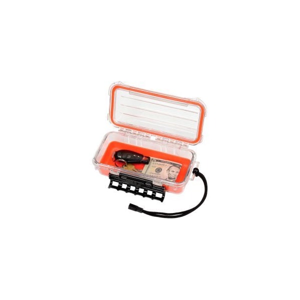PLANO 3550 GUIDE SERIES AIRTIGHT & WATERPROOF STORAGE CASE, 9"L X 4-7/8"W X 3"H, ORANGE THE 3500 SIZE WATERPROOF POLYCARBONATE STORAGE BOX IS THE PERFECT STORAGE SOLUTION FOR KEEPING CONTENTS DRY. MANUFACTURED FROM CRYSTAL CLEAR POLYCARBONATE, THIS STORAGE BOX FEATURES A CONTINUOUS O-RING SEAL THAT KEEPS WATER OUT*, A RUBBER LINING FOR PROTECTING VALUABLES, A TIGHT CLOSING CAM-ACTION LATCH AND LANYARD CARRY STRAP.*SUBMERSIBLE TO 1 METER UP TO 30 MINUTES.