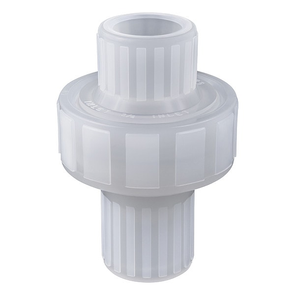 Item - Check Valves Check Valve, Flow Design Single, Mechanism and Body Design Inline Disc, Body Material - Valves Polypropylene, Pipe or Tube Size 1 in, Connection Type FNPT x Socket, Cracking Pressure 1.000 to 1.500 psi, Mounting Orientation Horizontal, Vertical, Seal Material Viton, Max. Temp. - Valves 180 Degrees F, Min. Temp. - Valves 32 Degrees F, Max. Water Pressure - Valves 100 psi @ 77 Degrees F, Max. Steam Pressure - Valves Not Rated, Seat Material Viton, Flow - Valves 12 gpm
