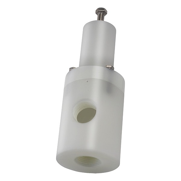 Adjustable Back Pressure Relief Valve, Body Material Polypropylene, Inlet Type FNPT, Outlet Type FNPT, Inlet Size 1 in, Outlet Size 1 in, Factory Set Pressure 150 psi, Pressure Range 5 to 100 psi, Not Applicable BtuH, Overall Height 9 13/16 in, Overall Length 3 in, Seat Material FKM, Spring Material Plated Steel, Temp. Range 32 Degrees to 180 Degrees F, Test Lever Test Lever Not Included, Standards ISO 9001:2015