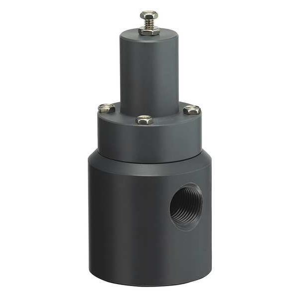 Adjustable Back Pressure Relief Valve, Body Material PVC, Inlet Type FNPT, Outlet Type FNPT, Inlet Size 1/2 in, Outlet Size 1/2 in, Factory Set Pressure 150 psi, Pressure Range 5 to 100 psi, Not Applicable BtuH, Overall Height 5 13/16 in, Application Corrosives, Overall Length 2 3/8 in, Seat Material FKM, Spring Material Plated Steel, Temp. Range 32 Degrees to 140 Degrees F, Test Lever Test Lever Not Included, Standards ISO 9001:2015