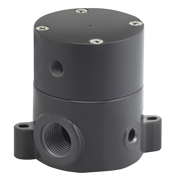 Pneumatically Actuated Diaphragm Valve, Coefficient of Volume (Cv) 5.8, Nominal Valve Size 3/4 in, Actuator Air Port Connection 1/8 in NPT, Connection Type - Side 1 NPT, Connection Type - Side 2 NPT, For Media Corrosive Chemicals, Water, Diaphragm Material PTFE, Operating Temperature - Maximum 180 Degrees F, Maximum Pressure - Operating 100 psi, Valve Deactivated State Normally Closed (NC), Body Material Polypropylene, Diaphragm Valve Type 3-Way, Seal Material PTFE, Overall Length 3 in