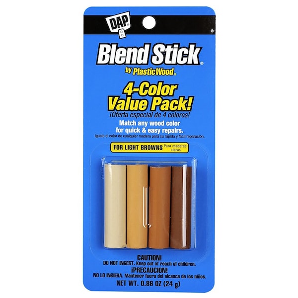 A fast, easy way to repair nail holes, scratches and other minor blemishes in finished wood surfaces. The four color sticks can be used individually or combined to match any wood tone. The Blend Stick's unique teardrop shape makes it easier to use than other blending products. Ideal for wood and simulated wood surfaces such as paneling, woodwork, moulding, furniture and cabinets. It will not shrink, stain or discolor.
