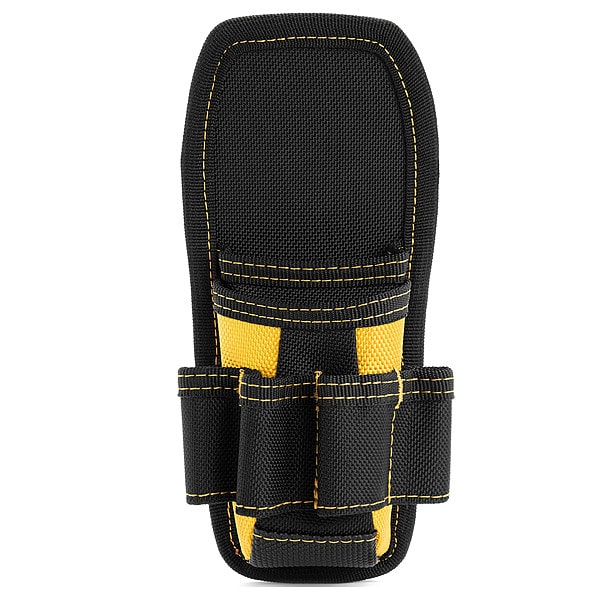 Tool Holster, Attachment Type Hook-and-Loop, Closure Type Open Top, Color Black/Yellow, Compatible with Manufacturer Model No. B120, B220, B320, Compatible with Product Type Backpack, Shoulder Bag, Tote, Features MOLLE Compatible, For Maximum Belt Width 3 in, Material Polyester, Number of Inside Pockets 0, Number of Outside Pockets 6, Number of Pockets 6, Overall Depth 2 1/2 in, Overall Height 8 7/8 in, Overall Width 3 7/8 in, Series Benchmark, Style Holster