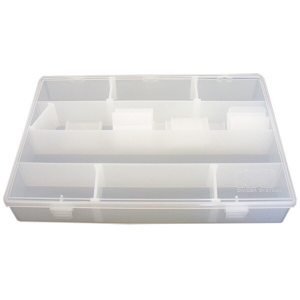 Container for Small Parts, Dividers are Moveable in 1/16" Increments Providing Flexibility in Organized Space. Resistant to Oil, Solvents, and Chemicals