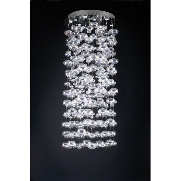 This 6 light Chandelier from the Bubble collection will provide the ultimate lighting solution with class and style. This contemporary chandelier is created with modern living in mind and this is captured perfectly in the way this hangs. 120v using six 50w bulbs to emit quality lighting through the bubble shaped iridescent glass. Expertly finished in polished chrome. This chandelier is not suitable for a vaulted ceiling.