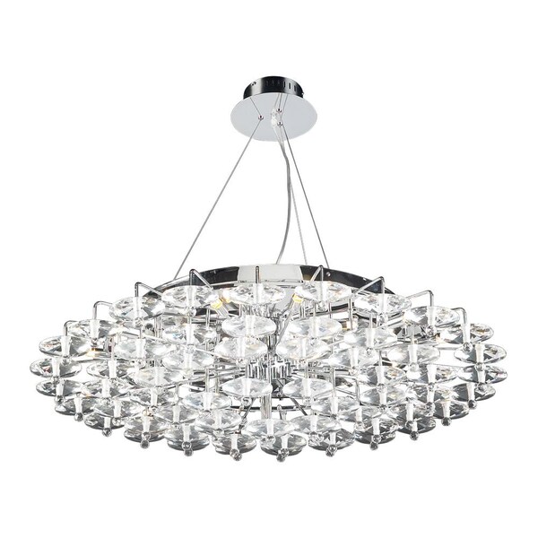 The 18 Light Chandelier from the Diamente Collection will create a perfect centerpiece for any ceiling in any room. With its modern design it is a classic ceiling light that will never date. 10" high and 38" wide, emitting quality light of 120v using eighteen 40w halogen bulbs which are included and shine brightly through the asfour handcut crystal glass and compliment the polished chrome finish perfectly.