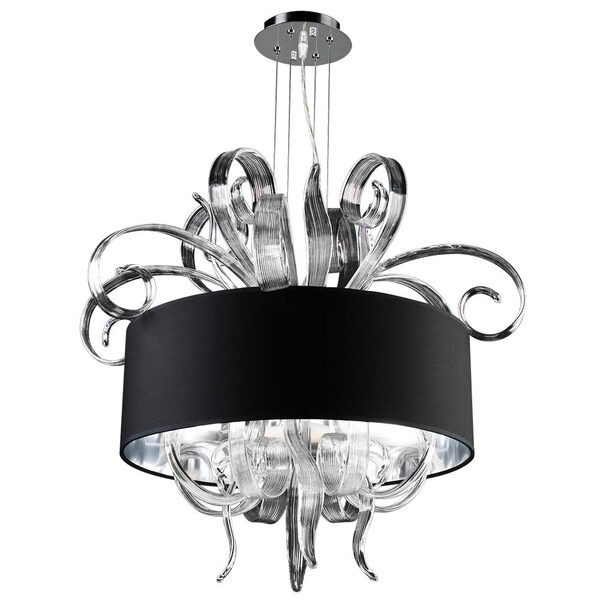 This 6 light Chandelier from the Valeriano collection is a perfect mix of traditional and modern design, ensuring that this will never date. Supplied with quick grip cable support for quick and easy adjustment and also clear glass arm this chandelier has an overall hanging height of 15ft. 120v requiring six 60w bulbs this will emit quality light from the black fabric shade (included) & clear glass. Completed with polished chrome finish this is a chandelier that cannot help but please.