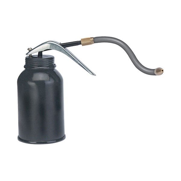 Flex spout oiler rugged epoxy finish resists rust 6 Oz size available with or without base holder. Rigid spouts have 0.15 inch diameter ledge-cone machined tips to lift oil filler dust caps. All flex spouts are zinc plated and detachable with a base thread of 1/4 inch 8 Oz capacity pistol oiler.