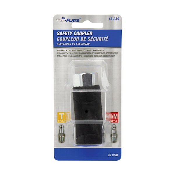 Safety couplers are made from light-weight, corrosion resistant composite and aluminum materials making them safer to use.The push button releases air pressure and eliminates blow back when connecting and disconnecting the coupler from the plug. Steel and aluminum coupler can be used with both T-style and I/M-style plugs. Black body. 1/4" Female Coupler.