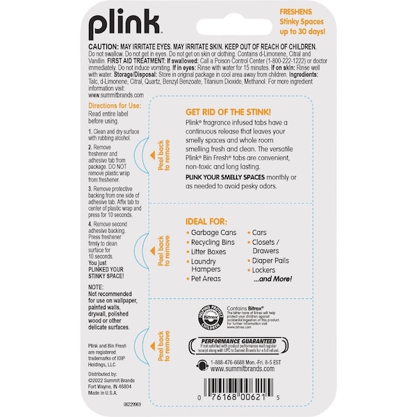 Plink Fresh Spaces Odor Eliminator is your ideal solution for maintaining freshness in various naturally smelly spaces. Designed to tackle tough odors this convenient product makes freshening stinky (or smelly) spaces easy. Works wonders in garbage and recycling bins diaper pails and other challenging areas by neutralizing odors and leaving a lasting clean scent. Its innovative fragrance technology ensures up to 30 days of odor control making it a must-have in your household. Easy to apply and versatile it can be used in laundry hampers closets and even cars. Say goodbye to unpleasant smells and hello to freshness with Plink Fresh Spaces Odor Eliminator the ultimate odor eliminator for your home.