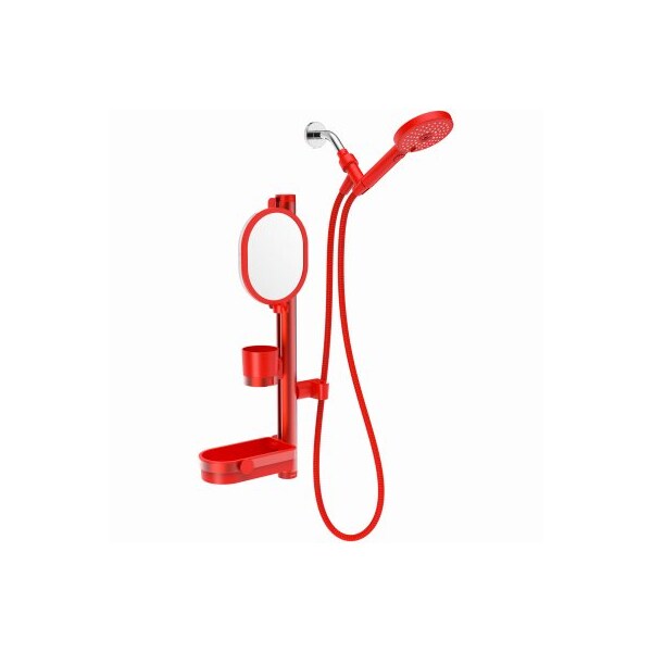 sproos 5 red hand held shower system that includes bracket, hose, rail Also includes accessory items antifog mirror, shelf, and cup with holder Simple installation, no drilling required, includes wrench, supplies and adhesives