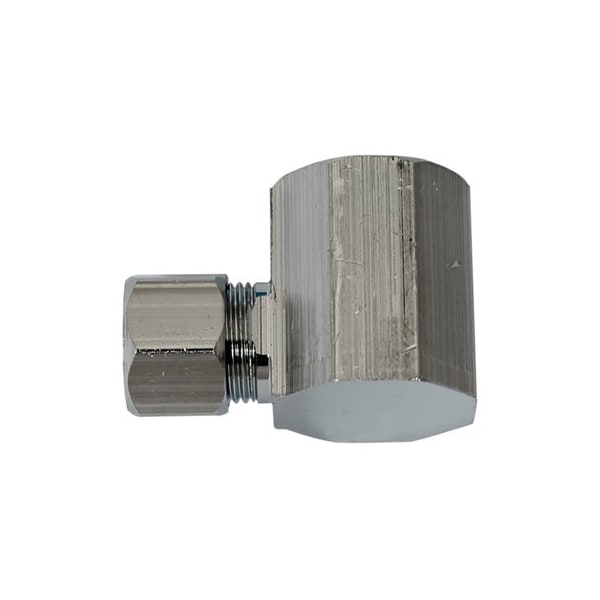 Angle Connector, Inlet Of 12 Female Threaded Pipe Outlet Of 38 OD, Chrome Plated Brass, Meets All Lead Free Requirements