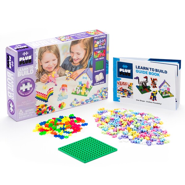 Plus-Plus is a whole new class of construction toy! One simple shape contains endless possibility and hours of fun. Each piece easily connects to the next and lets your imagination create colorful flat mosaics or work in 3-D to make more intricate builds. Even curves are possible thanks to the unique design of this deceptively simple shape! A perfect STEM toy to develop fine motor skills, focus and patience - as well as design, imagination and creativity! All Plus-Plus sets are compatible with each other and this open play set adds more pieces and colors to the collection for more possibilities and fun. This Learn to Build set contains Pastel Colors, including Purple, Pink, Green, Yellow, White, and more. Also includes 100 neon pieces, an Idea Guide Booklet and Baseplate for more building. BPA-free and phthalate-free.