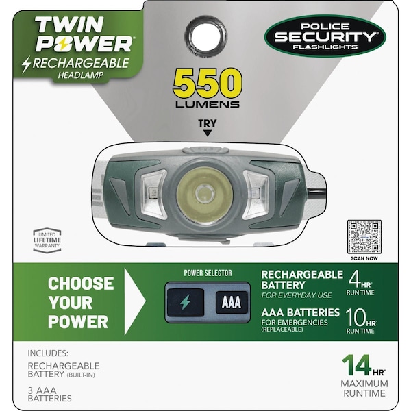 Police Securitys Twin Power Ryder Headlamp is a groundbreaking 550-lumen patent-pending technology that redefines traditional Dual Power functionality. Simply toggle between alkaline and rechargeable battery sources with the touch of a button ensuring uninterrupted illumination whenever you need it. The built in rechargeable battery is housed in the head of the headlamp and the rear battery cartridge holds (3)AA batteries. With this innovative design youll never face the dilemma of drained power. Twist focus and comfort adjust straps make this headlamp versatile for a variety of hands-free uses.