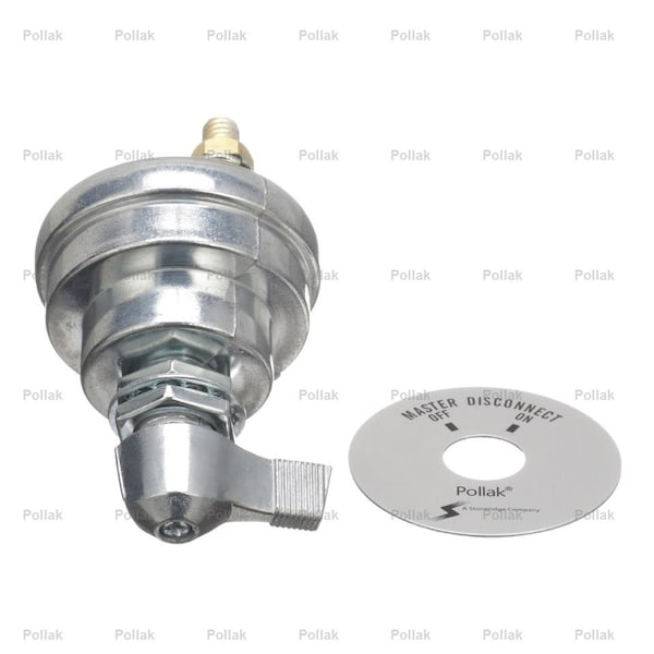 For Battery Circuit Only; Used For Protection Against Battery Drain/ Electrical Fires/ Tampering/ Theft; 6 To 36 Volt DC; Single Pole Single Throw Lever Operated; 180 Amp; 2-5/8 Inch Diameter; 4-3/8 Inch Overall Length; With Two 3/8 Inch Copper Alloy Stud Terminals/ Hex Nuts/ Lock Washers; With 4 Color Retail Bag