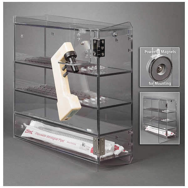 Item Serological Pipette Holder, Mounting Type Magnets, Number of Compartments 4, Autoclavable No, Material PETG, Clear, Height 16 19/64 in, Length 16 1/2 in, Width 5 1/2 in, For Use With Serological Pipette, Includes Pipette Filler Bracket, Powerful Magnet Mount, Lab Rack Capacity Holds 4 Types of Serological Pipettes and 1 Pipette Aid