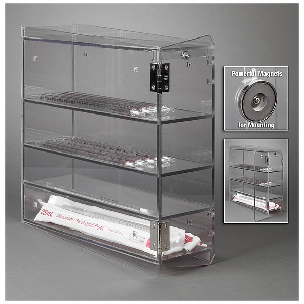 Item Serological Pipette Holder, Mounting Type Magnets, Number of Compartments 4, Autoclavable No, Material PETG, Clear, Height 16 19/64 in, Length 16 1/2 in, Width 5 1/2 in, For Use With Serological Pipette, Includes Powerful Magnet Mount, Lab Rack Capacity Holds 4 Types of Serological Pipettes