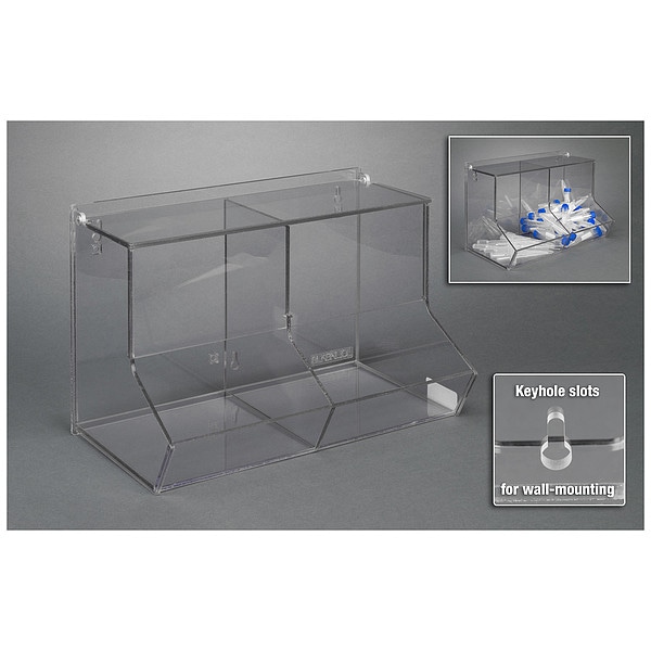 Item Two Compartment Bulk Bin, Number of Compartments 2, Autoclavable No, Material PETG, Clear, Height 8 1/2 in, Width 14 in, Includes Screws/Anchors