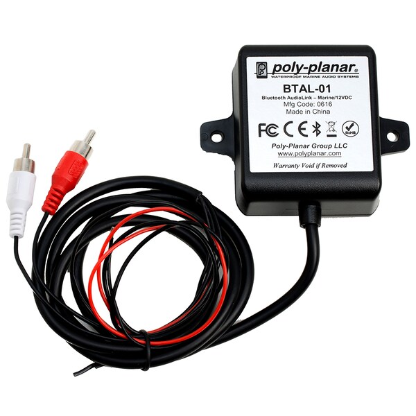 Bluetooth AudioLink - 12VDC. Adds the Bluetooth feature to a non-bluetooth stereo,Features, Bluetooth, Marine Grade, 12VDC, 33 Feet Effective Range, A2DP version 3.0, 4 Feet Audio Out Cable Length (RCA Out), Available in black only, Dimension: 3.5in x 2.75in x 1in.