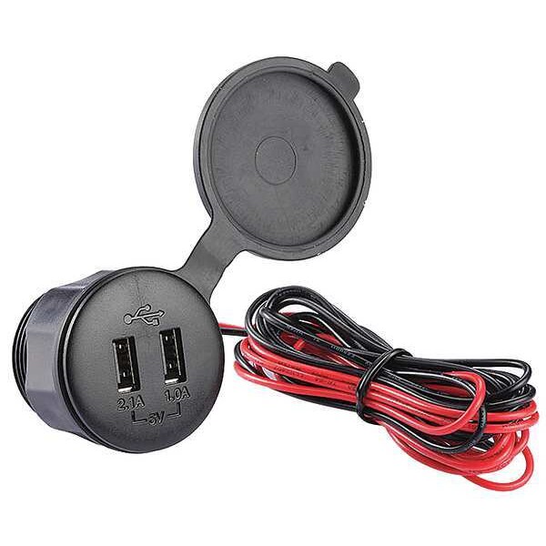 USB Charger, Features 1.0A Fast Charger USB Port, 2.1A Fast Charger USB Port, Waterproof, For Use With GPS Devices, Smart Phones, Tablets, Product Type Dual Port USB Charger, Includes Red and Black Wire Leads, Standards CE, FCC, RoHS Compliant