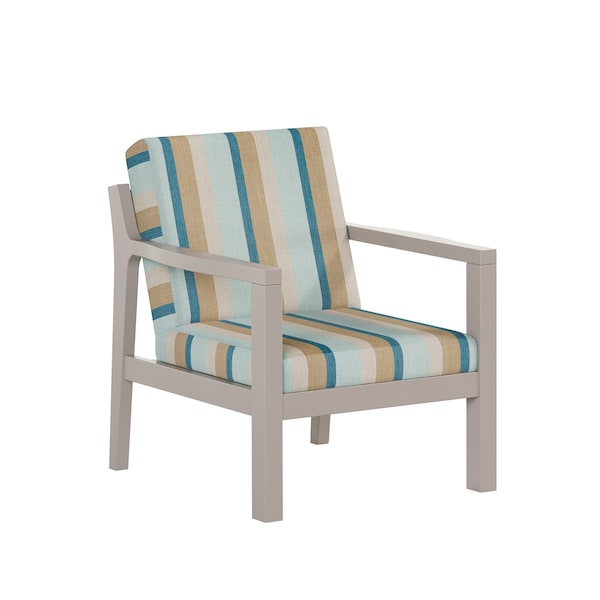 POLYBIRD BREEZE DEEP SEAT CHAIR. FRAME COLOR SAND WITH SUNBRELLA GATEWAY MIST FABRIC. HIGH QUALITY HDPE POLY LUMBER, 316 MARINE GRADE STAINLESS HARDWARE, FADE AND ROT RESISTANT, MAINTENANCE FREE!! BIFMA M&E STANDARDS FOR COMMERCIAL AND RESIDENTIAL USE! 100% END OF LIFE RECYCLABLE FOR A SUSTAINABLE FUTURE! POLYBIRD BREEZE DEEP SEAT CHAIR, SEAT SIZE: 22in W x 23in D x 17in H; OVERALL SIZE : 24in W x 27in D x 30in H