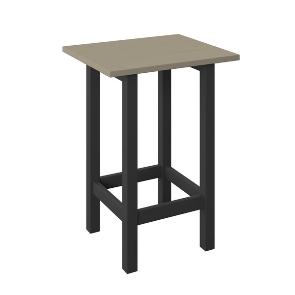 POLYBIRD MODERN BALCONY END TABLE. COLOR WEATHERWOOD TOP AND BLACK BASE. HIGH QUALITY HDPE POLY LUMBER, 316 MARINE GRADE STAINLESS HARDWARE, FADE AND ROT RESISTANT, MAINTENANCE FREE!! BIFMA M&E STANDARDS FOR COMMERCIAL AND RESIDENTIAL USE! 100% END OF LIFE RECYCLABLE FOR A SUSTAINABLE FUTURE! MODERN BALCONY END TABLE: SIZE 16in W x 19in D x 26in H; OVERALL: 16in W x 19in D x 26in H.