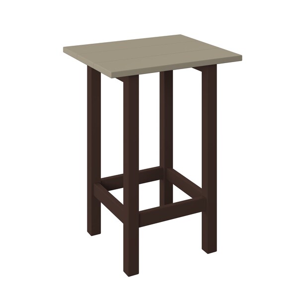 POLYBIRD MODERN BALCONY END TABLE. COLOR WEATHERWOOD TOP AND TUDOR BROWN BASE. HIGH QUALITY HDPE POLY LUMBER, 316 MARINE GRADE STAINLESS HARDWARE, FADE AND ROT RESISTANT, MAINTENANCE FREE!! BIFMA M&E STANDARDS FOR COMMERCIAL AND RESIDENTIAL USE! 100% END OF LIFE RECYCLABLE FOR A SUSTAINABLE FUTURE! MODERN BALCONY END TABLE: SIZE 16in W x 19in D x 26in H; OVERALL: 16in W x 19in D x 26in H.