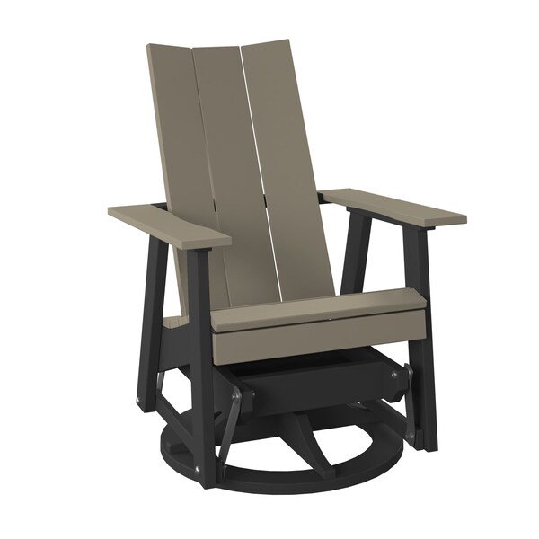 POLYBIRD MODERN SWIVEL GLIDER. COLOR WEATHERWOOD TOP AND BLACK BASE. HIGH QUALITY HDPE POLY LUMBER, 316 MARINE GRADE STAINLESS HARDWARE, FADE AND ROT RESISTANT, MAINTENANCE FREE!! BIFMA M&E STANDARDS FOR COMMERCIAL AND RESIDENTIAL USE! 100% END OF LIFE RECYCLABLE FOR A SUSTAINABLE FUTURE! MODERN SWIVEL GLIDER CHAIR: SEAT SIZE 21in W x 17in D x 16in H; OVERALL SIZE : 28in W x 32in D x 38in H