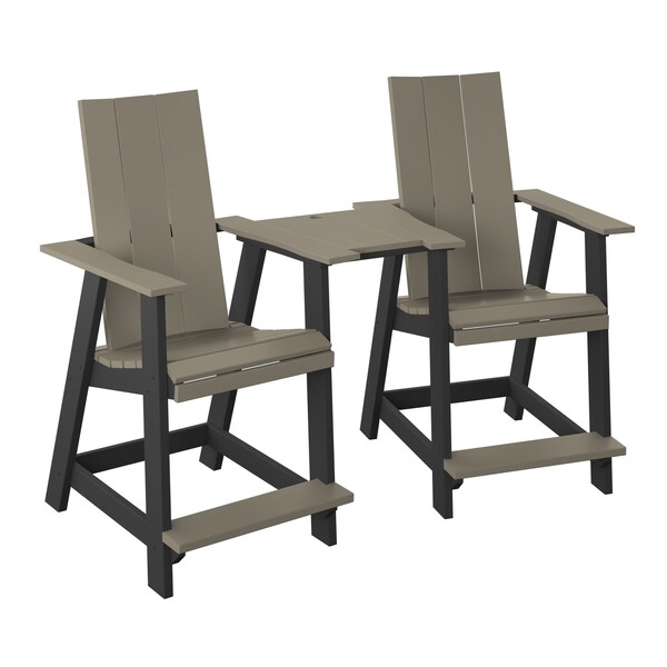 POLYBIRD MODERN TETE-A-TETE. COLOR WEATHERWOOD TOP AND BLACK BASE. HIGH QUALITY HDPE POLY LUMBER, 316 MARINE GRADE STAINLESS HARDWARE, FADE AND ROT RESISTANT, MAINTENANCE FREE!! BIFMA M&E STANDARDS FOR COMMERCIAL AND RESIDENTIAL USE! 100% END OF LIFE RECYCLABLE FOR A SUSTAINABLE FUTURE! MODERN TETE-A-TETE ( TWO MODERN BALCONY CHAIRS P64 WITH ATTACHED TABLE IN BETWEEN): SEAT SIZE 20in W x 19in D x 24in H; OVERALL SIZE : 70in W x 37in D x 45in H.