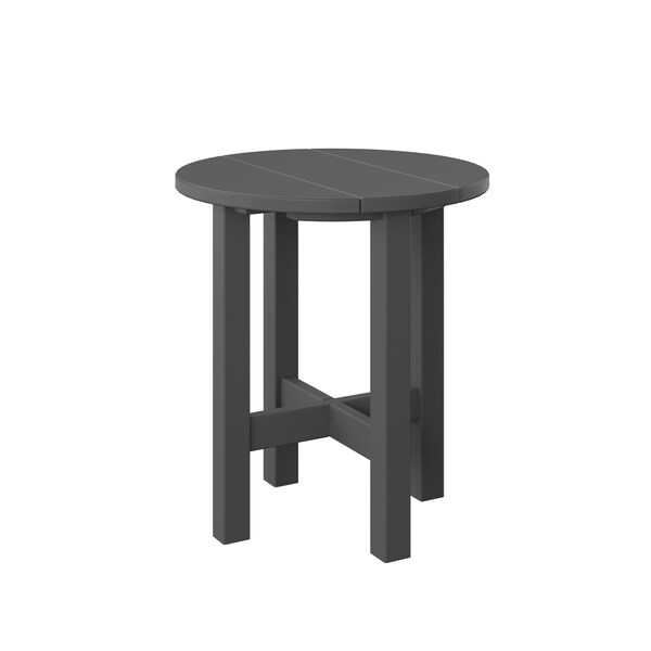 POLYBIRD ROUND END TABLE. COLOR CHARCOAL. HIGH QUALITY HDPE POLY LUMBER, 316 MARINE GRADE STAINLESS HARDWARE, FADE AND ROT RESISTANT, MAINTENANCE FREE!! BIFMA M&E STANDARDS FOR COMMERCIAL AND RESIDENTIAL USE! 100% END OF LIFE RECYCLABLE FOR A SUSTAINABLE FUTURE! ROUND END TABLE: SIZE 16in W x 16in D x 18in H;