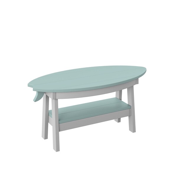POLYBIRD SURFBOARD COFFEE TABLE. COLOR SAGE TOP AND WHITE BASE. HIGH QUALITY HDPE POLY LUMBER, 316 MARINE GRADE STAINLESS HARDWARE, FADE AND ROT RESISTANT, MAINTENANCE FREE!! BIFMA M&E STANDARDS FOR COMMERCIAL AND RESIDENTIAL USE! 100% END OF LIFE RECYCLABLE FOR A SUSTAINABLE FUTURE! POLYBIRD SURFBOARD COFFEE TABLE, SIZE 48in W x 17in D x 16in H; OVERALL SIZE : 48in W x 17in D x 16in H