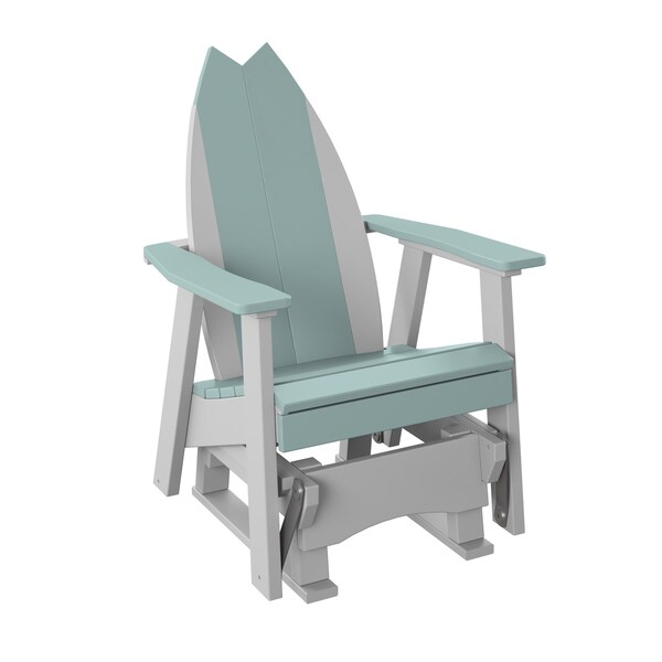 POLYBIRD SURFBOARD-TAIL 2' GLIDER. COLOR SAGE TOP AND WHITE BASE. HIGH QUALITY HDPE POLY LUMBER, 316 MARINE GRADE STAINLESS HARDWARE, FADE AND ROT RESISTANT, MAINTENANCE FREE!! BIFMA M&E STANDARDS FOR COMMERCIAL AND RESIDENTIAL USE! 100% END OF LIFE RECYCLABLE FOR A SUSTAINABLE FUTURE! POLYBIRD SURFBOARD - TAIL 2' GLIDER CHAIR: SEAT SIZE 21in W x 18in D x 17in H; OVERALL SIZE : 28in W x 28in D x 37in H