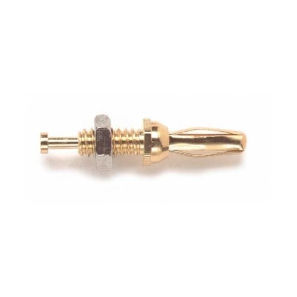 Banana Plug, Contact Finish Nickel Plated, Contact Material Brass, Maximum Current 5 A, Color Gold, Body Material Brass, Maximum Voltage 2,500 V, Length 1/2 in, Contact Spacing Not Applicable, Features Low Contact Resistance, Solder Turret Allows Wire Attachment, Threaded Stud Enables Fast and Easy Mounting to Panels, Contact Diameter 1/8 in, Maximum Operating Temperature Not Applicable, Includes Screw with Solder Turret, Spring Material Beryllium Copper, Standards CE, CSA, IEC 61010
