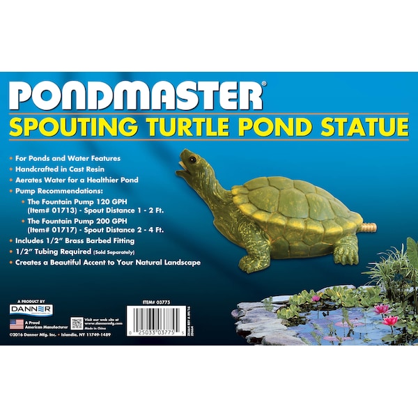 Spouting Turtle Pond statue creates a beautiful and lively water action for ponds and water features. Handcrafted in cast resin. Aerates water for a healthier pond. Coated brass barbed fitting accepts 1/2" flexible tubing. Easy hook up to a submersible pump.